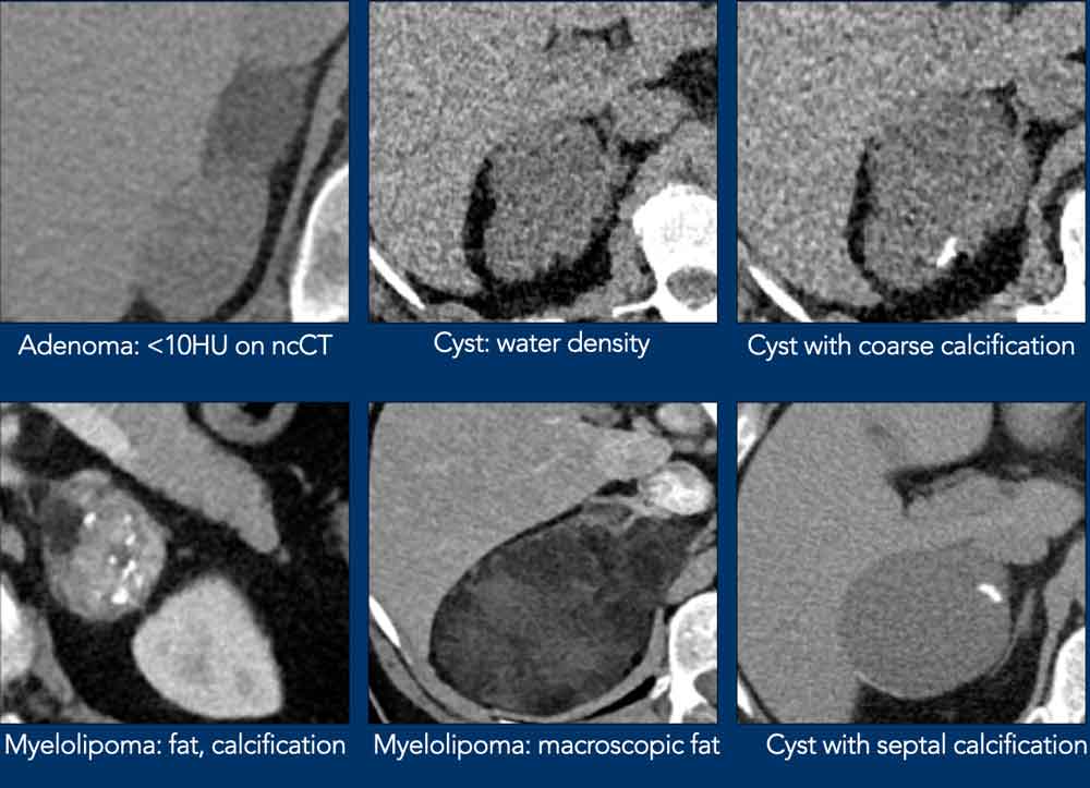 Many adrenal lesions can be categorized as typically benign and need no follow up: