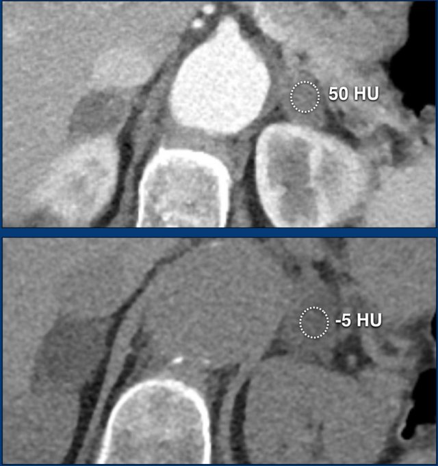 - a noncontrast CT (ncCT) attenuation threshold of ≤10 Hounsfield units (HU) to indicate benignity, and