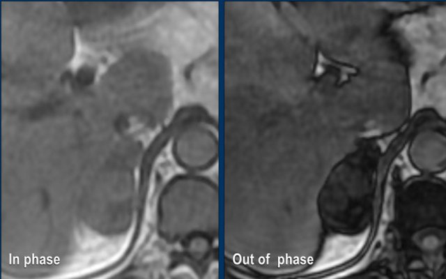MRI utilizing in-phase and opposed-phase sequences can effectively demonstrate microscopic fat within adrenal adenomas. The presence of intracellular lipid results in a characteristic signal drop on opposed-phase images due to the chemical shift artifact.
