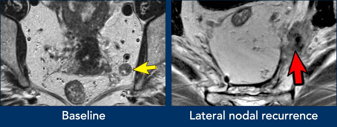 Highlight in report the level of most proximal N+ node (to guide radiotherapy and surgical planning, presence of lateral (obturator, internal iliac) N+ nodes, incl. size and location and presence of tumor deposits.