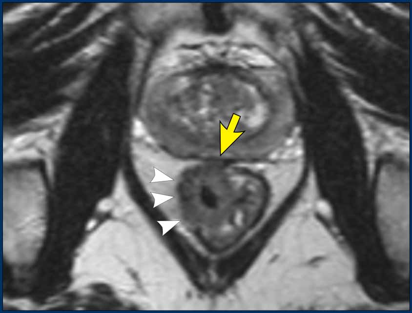 - T2-weighted MRI: Tumor barely recognizable due to fecal obscuration.