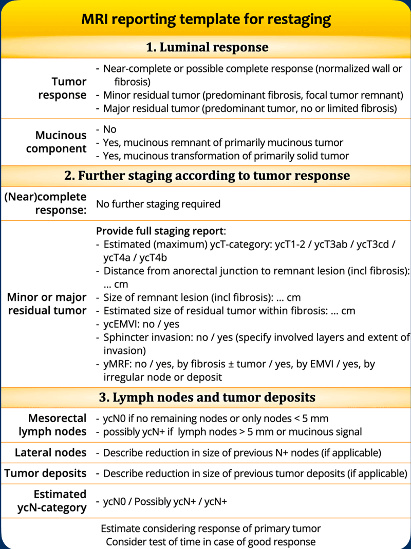 - Recommendations on when to perform restaging MRI vary among guidelines from 6–12 weeks post-treatment.
