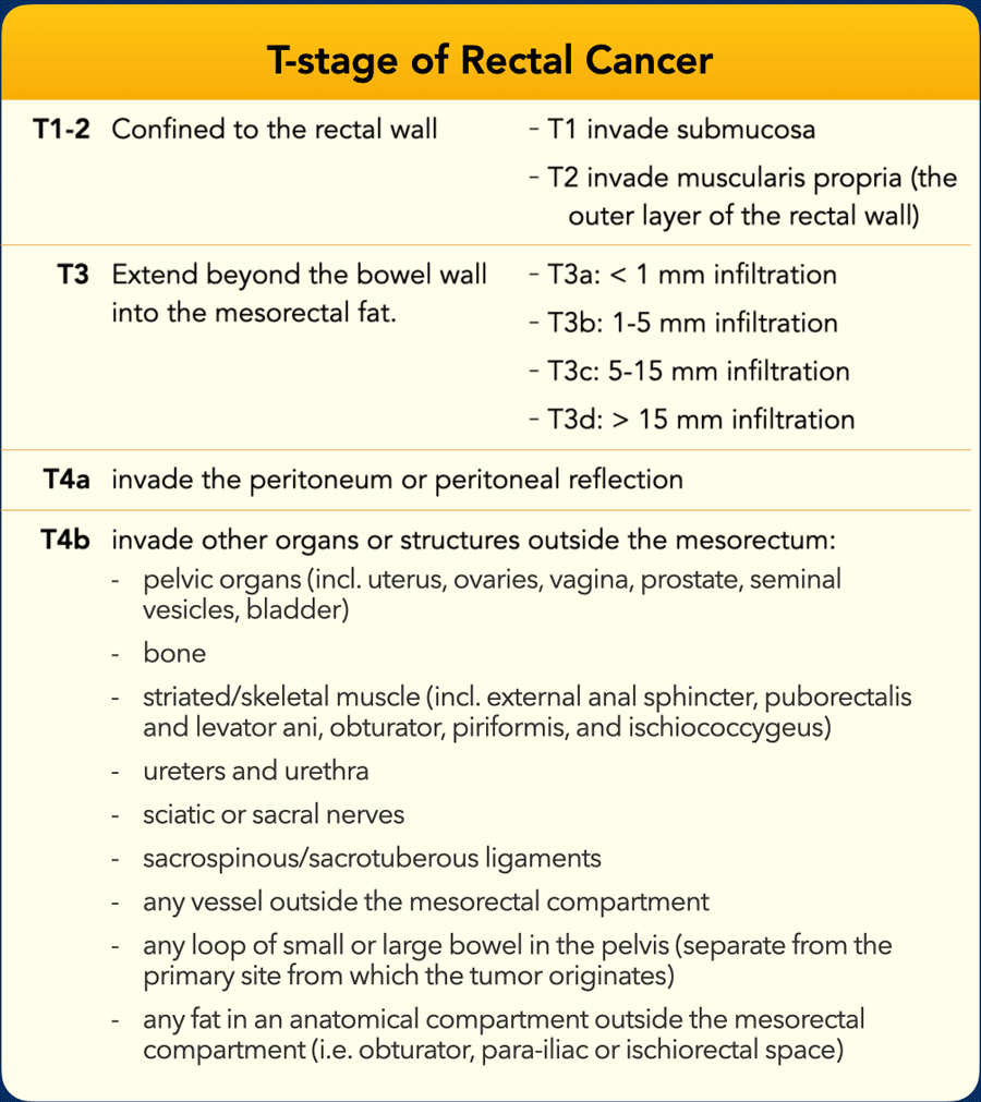 - Purpose: Accurate assessment of tumor extension beyond the rectal wall and distance to the MRF