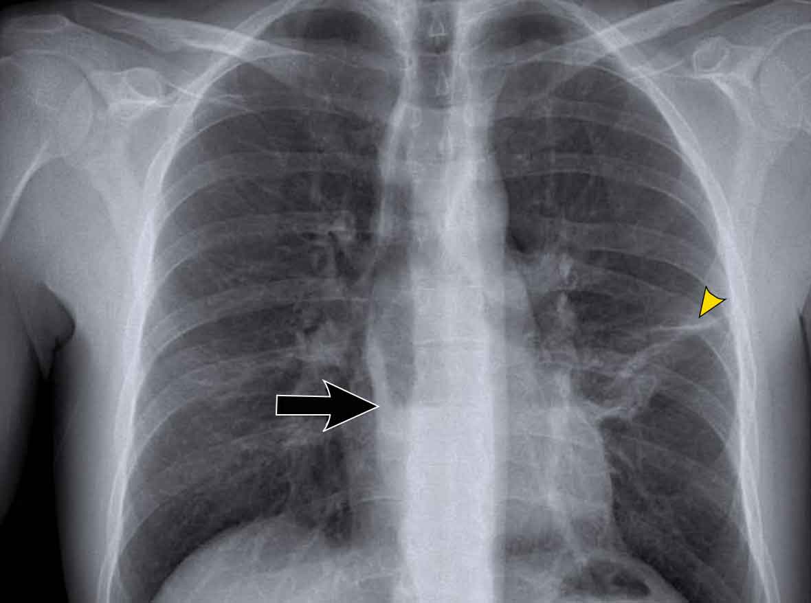 A key mediastinal–pulmonary interface to assess is the azygoesophageal recess (yellow arrow).