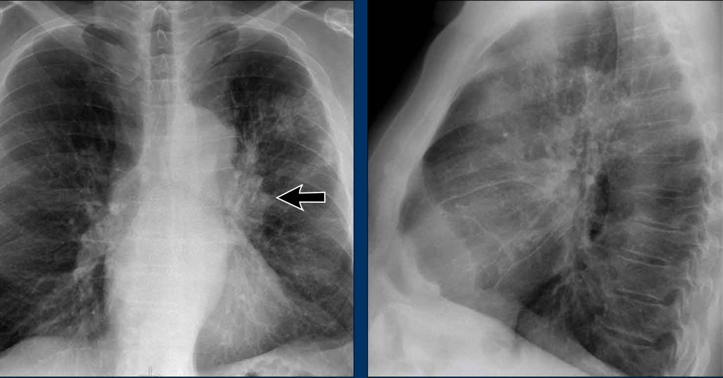 • On the lateral view, the presence of rounded opacities in regions where pulmonary vessels are not normally seen strongly suggests enlarged lymph nodes.