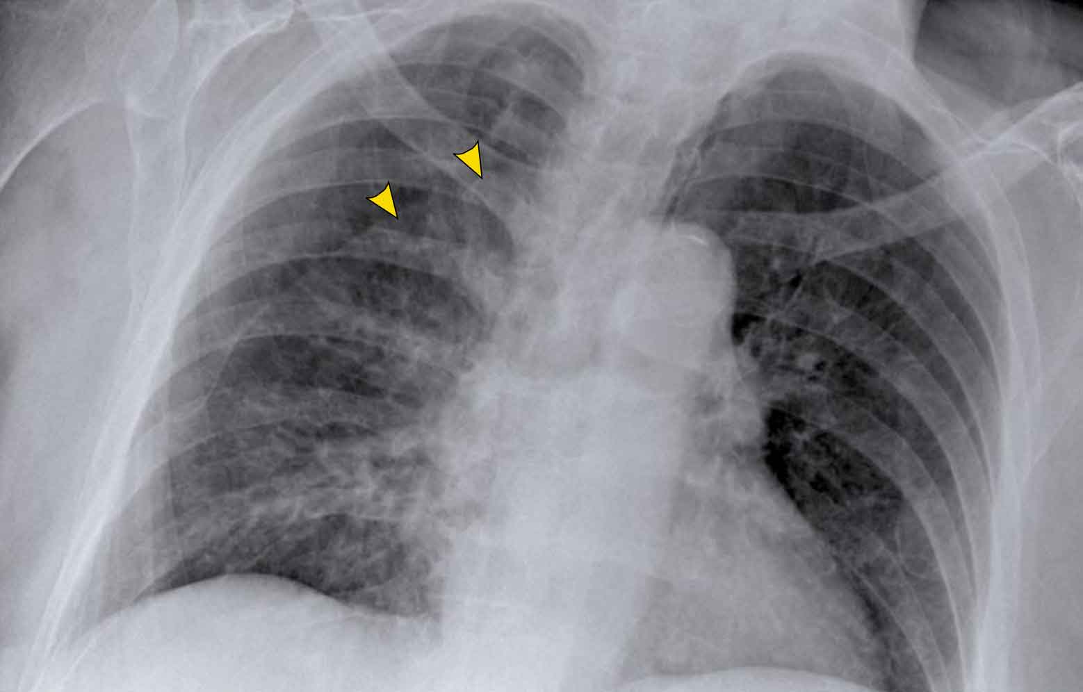 • Lung cyst in the right upper lobe (yellow arrowhead)