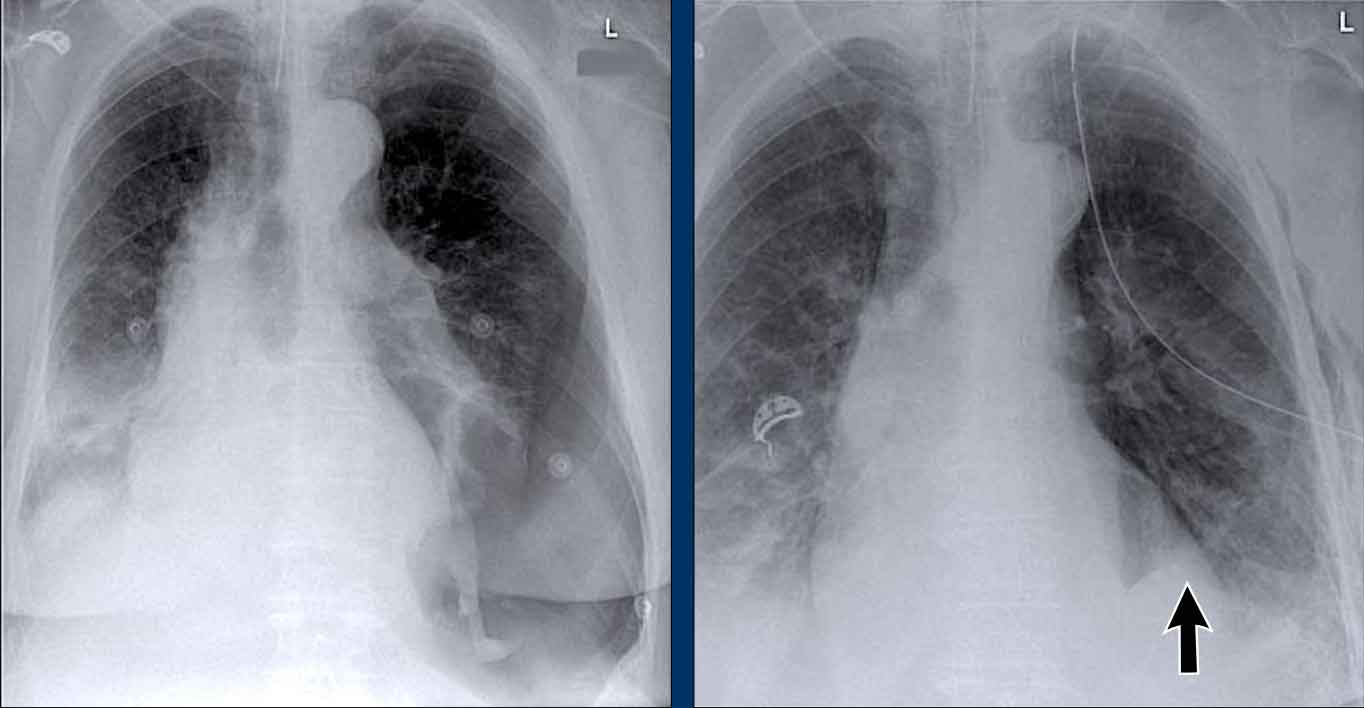 Post–chest tube insertion, the diaphragm returns to normal position (arrow(), confirming decompression.
