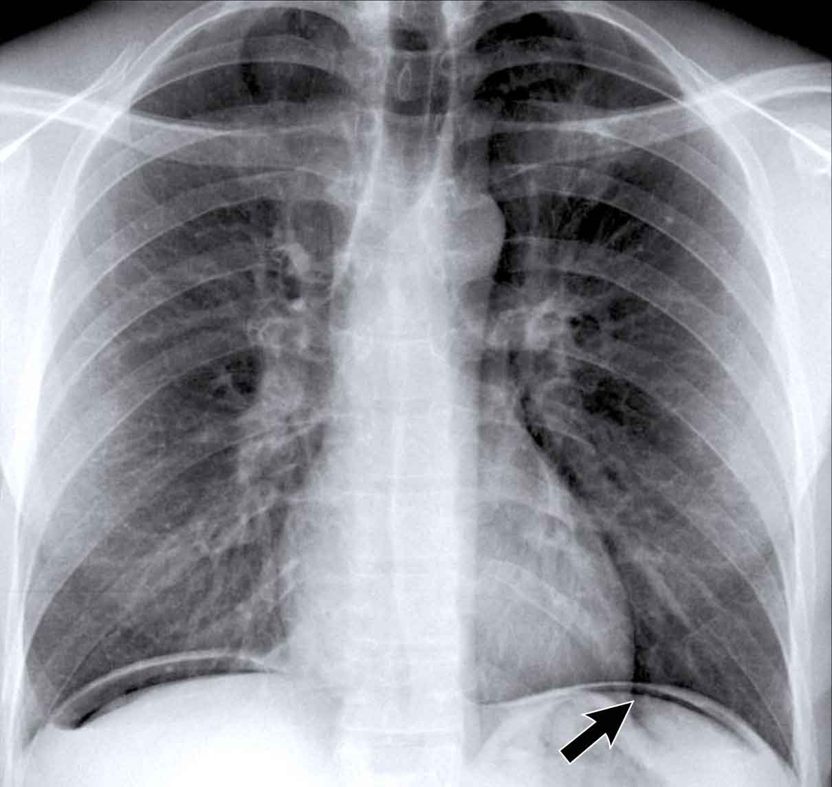 • Differential includes postoperative pneumoperitoneum, which may persist for several days after abdominal surgery.