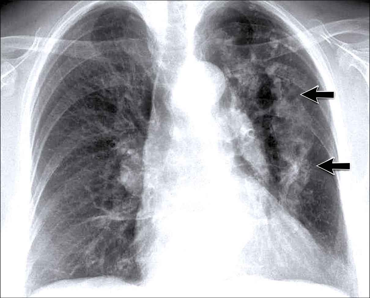 The radiograph demonstrates multiple rib deformities consistent with old fractures (arrows).