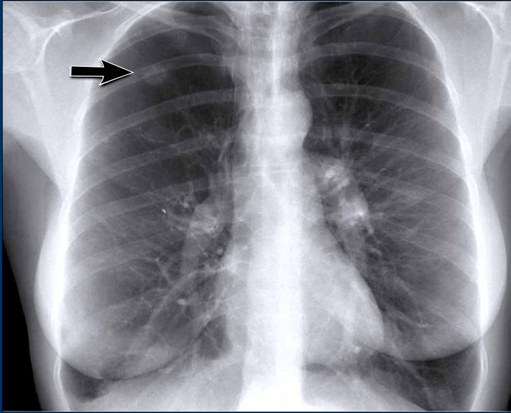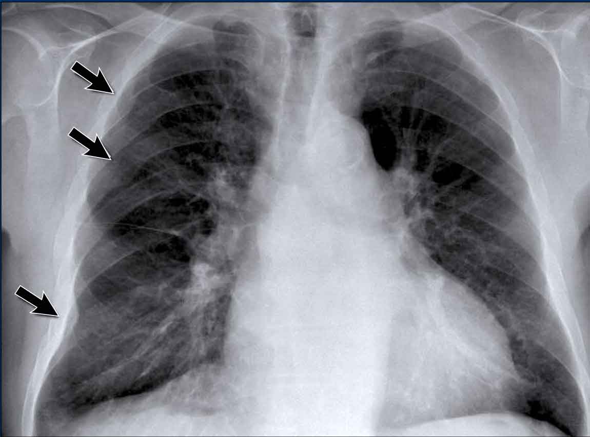 • Chest X-ray shows a retracted visceral pleura (blue arrow), consistent with pneumothorax.