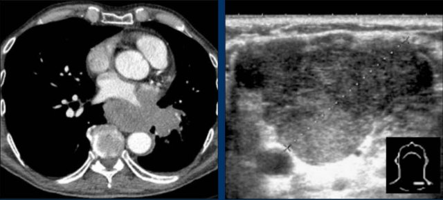 • It is located anteriorly, often presenting as a right-sided retrosternal mass.
