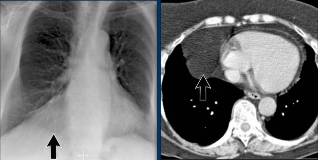 This appearance can mimic right middle lobe consolidation or atelectasis due to loss of the normal silhouette (silhouette sign).