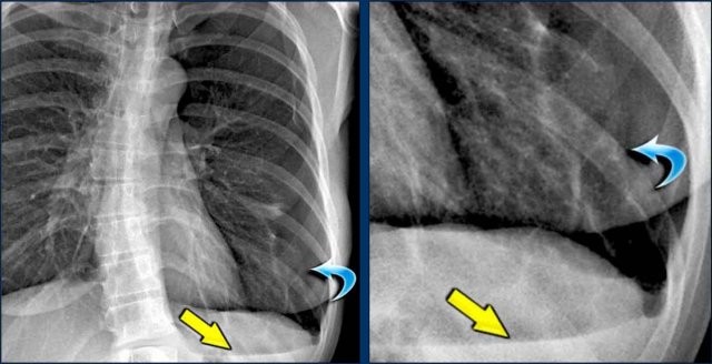 • The left hemidiaphragm is usually visible only up to the point where it is adjacent to the cardiac silhouette (blue arrow), beyond which the interface is lost due to the similar radiodensity of the heart and upper abdominal contents.